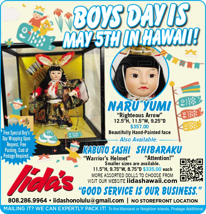 “Tango No Sekku,” otherwise known as Boy’s Day observed by the Japanese throughout the state, falls on the fifth of May. It is also recognized in Japan as Childrens’ Day, a day of celebration since ancient times. When a boy is born, this festive day in his first year is regarded as an important occasion. Besides flying carps and streamers, dolls representing ancient, legendary war heroes are prominently displayed. Just as carps are known to struggle swimming up waterfalls, they symbolize courage, strength and virility – qualities that parents hope to have their son attain success by overcoming life’s obstacles.